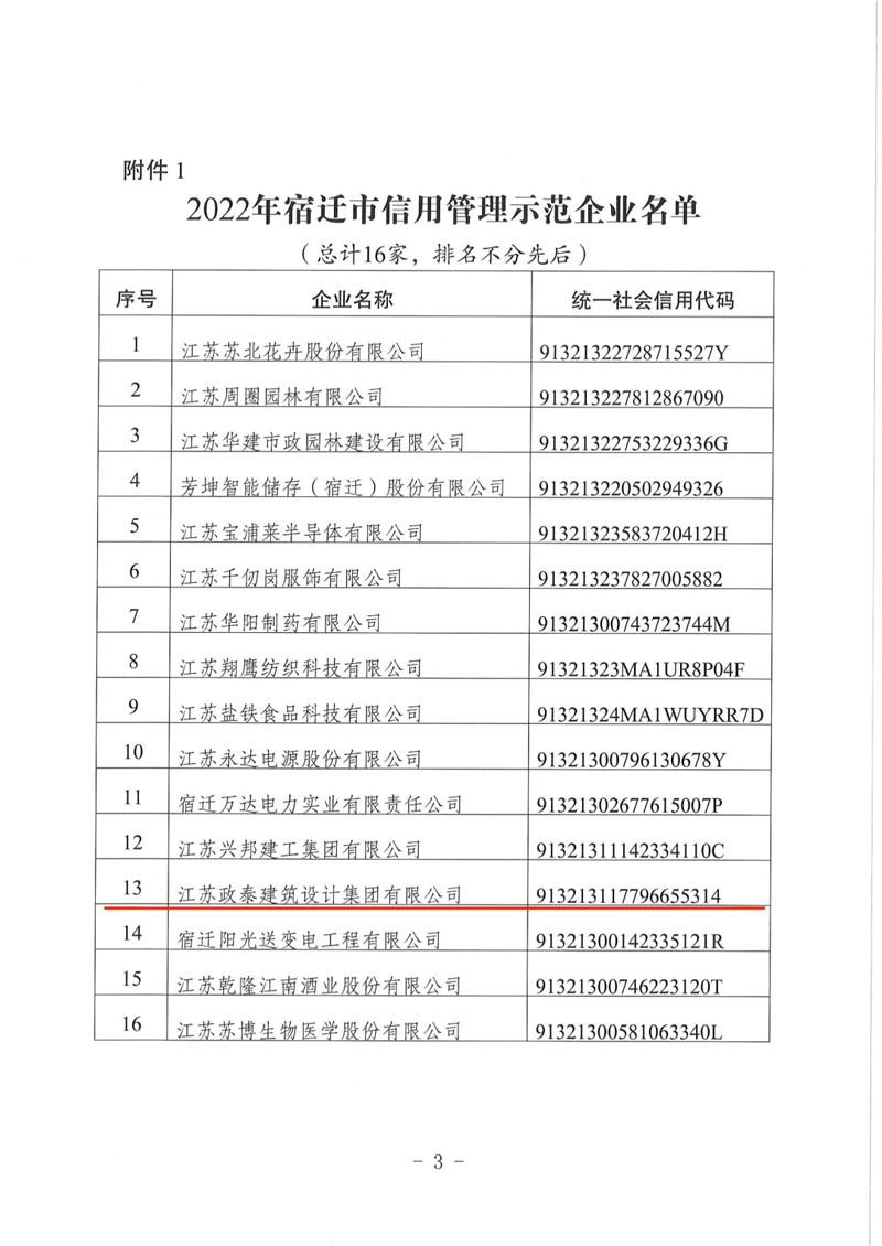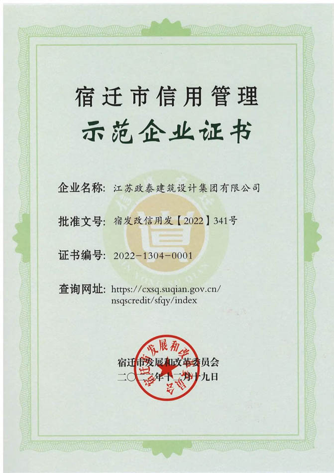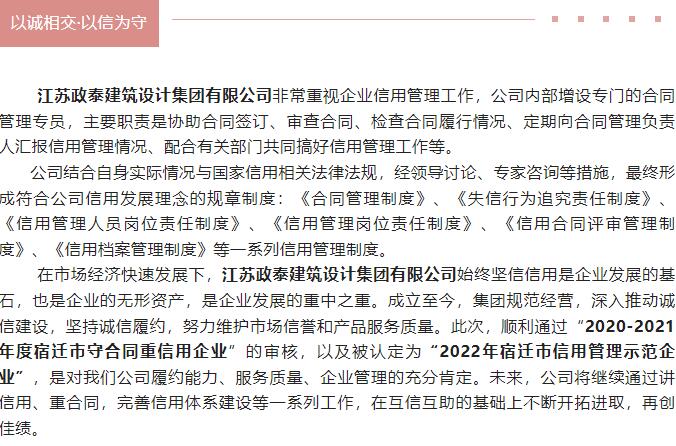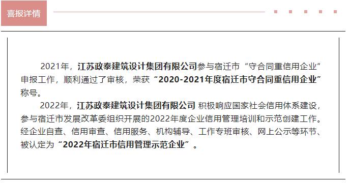 喜報(bào)丨政泰設(shè)計(jì)集團(tuán)榮獲“2022年宿遷市信用管理示范企業(yè)”稱號(hào)、“2020—2021年度宿遷市守合同重信用企業(yè)”稱號(hào)